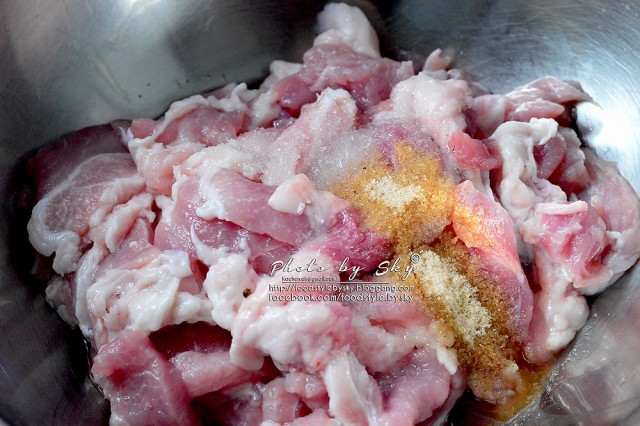 ๑.หั่นหมูชิ้นพอดีไม่บางและหนามากจนเกินไป ขนาดพอดีคำก็ได้ ใส่ในกะละมังไว้ ตามด้วยผงปรุงรส ชูรส น้ำปลา